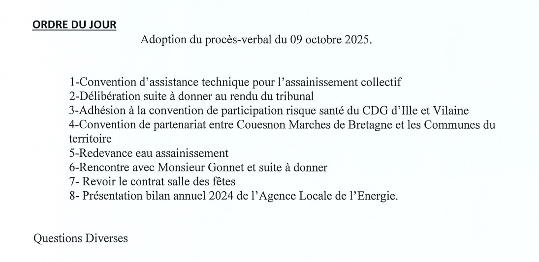 Conseil municipal du lundi 24 novembre 2025 à 21h00 (celui du 17 novembre est reporté : pas le quorum)