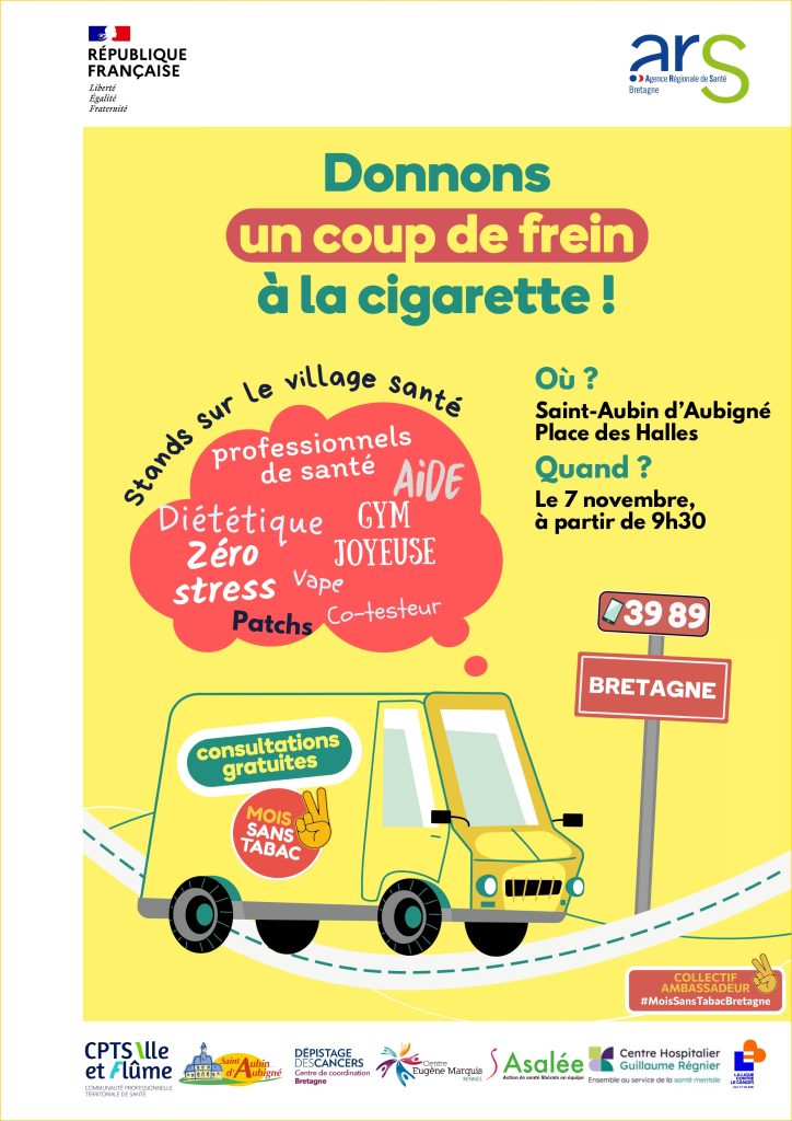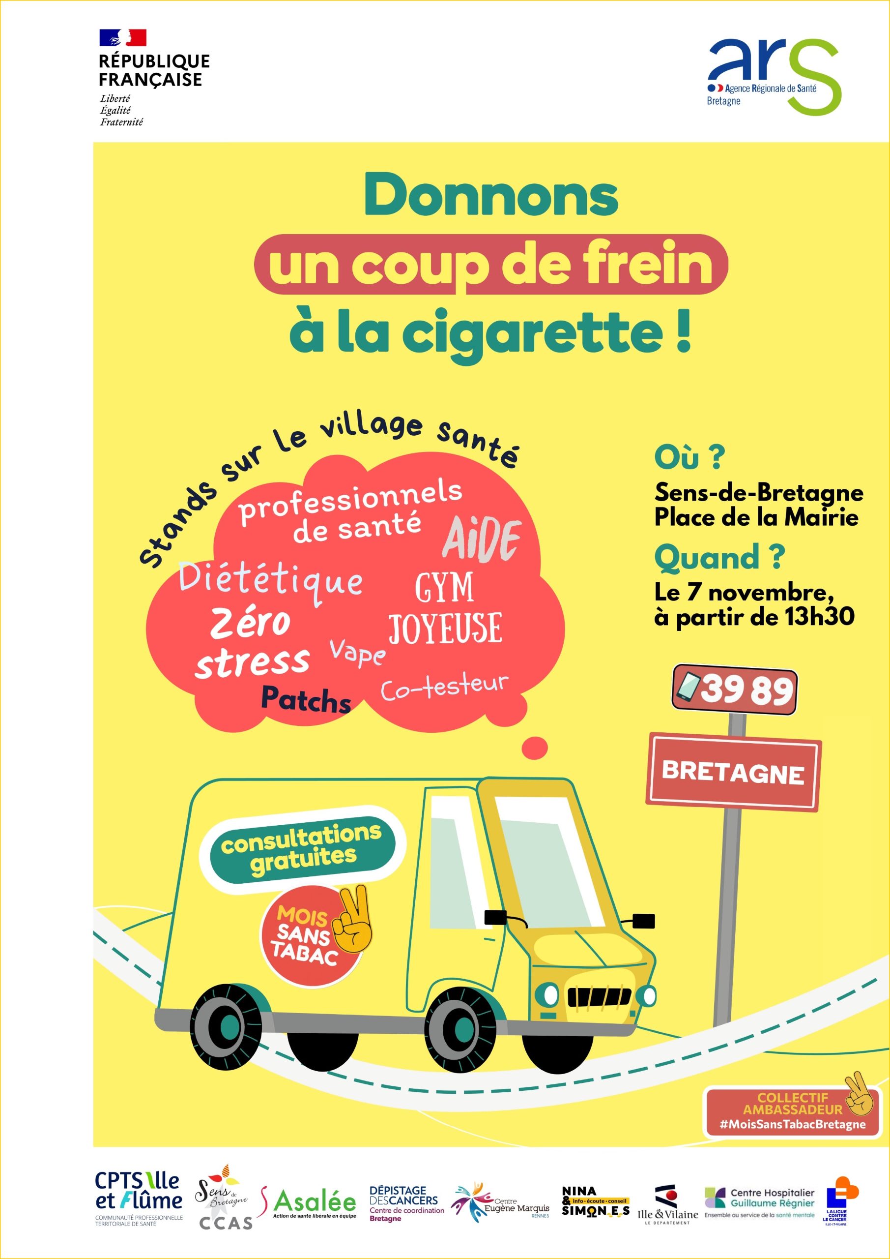 - Parallèlement au circuit de la camionnette, un dispositif mobile national conçu par Santé publique France stationnera à Rennes le 18 novembre 2025, place de la Mairie de 9h à 19h. Il sera animé par des préventeurs et des tabacologues qui apporteront gratuitement aux rennais des informations sur l’aide au sevrage tabagique, l’alimentation, la gestion du stress.