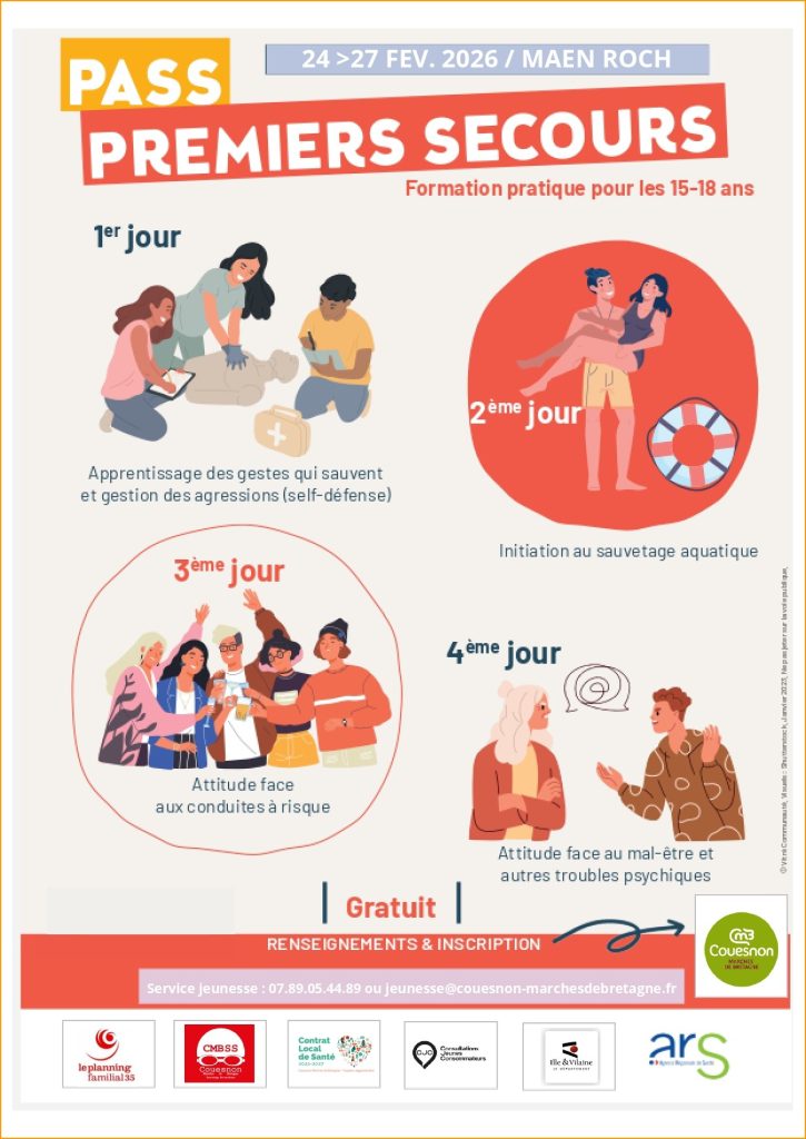 Dans le cadre du Contrat Local de Santé, le service jeunesse et santé de Couesnon Marches de Bretagne, en partenariat avec plusieurs acteurs locaux, organise pour la première fois un Pass Premiers Secours à destination des jeunes de 15 à 18 ans de Couesnon Marches de Bretagne, pendant les vacances d’hiver 2026, du 24 au 27 février.