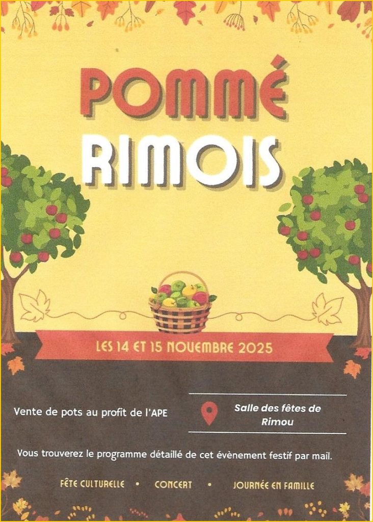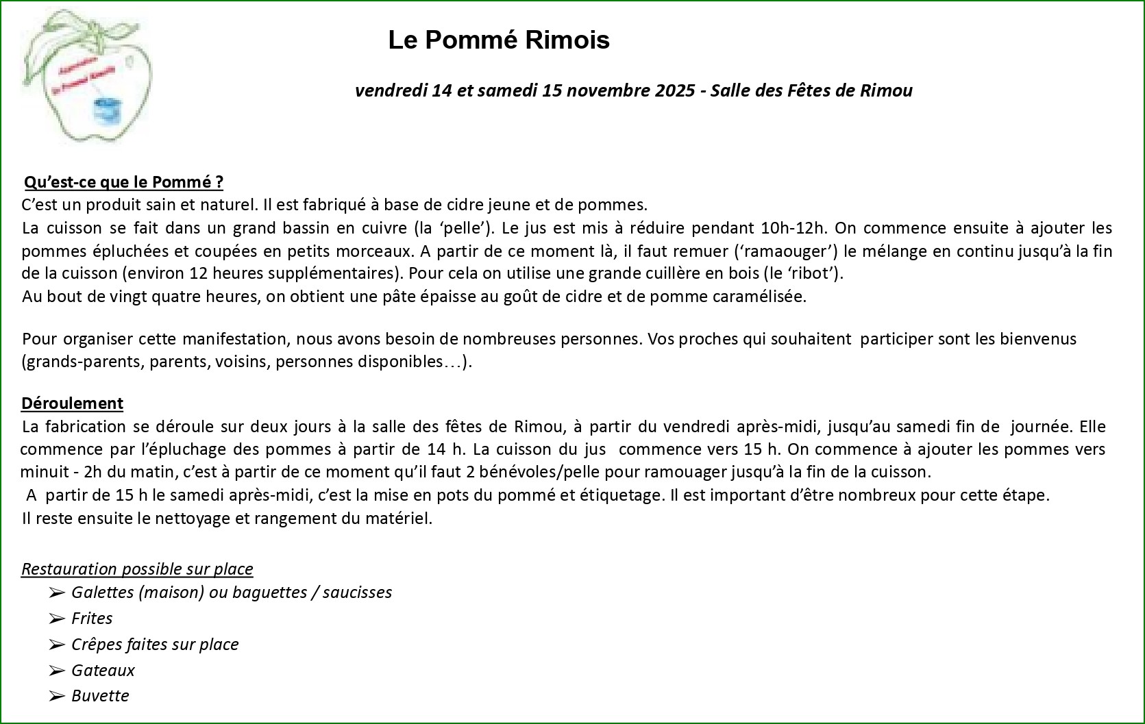 L’événement automnal à Rimou approche à grands pas. Et oui, il s’agit bien de la célèbre fête du Pommé qui se déroulera le Vendredi 14 et Samedi 15 Novembre à la salle des fêtes de Rmou. Pour rappel, cette fête à pour but la fabrication du pommé. L’APE s’associe à l’association du pommé Rimois, le comité des fêtes de Rimou et à l’ACCA de Romazy pour l’organisation de ces journées.