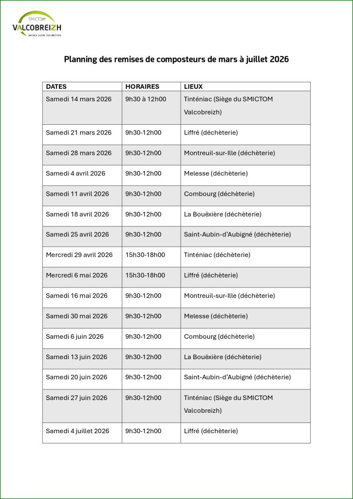De mars à juillet, 16 rendez-vous sont programmés. Les distributions auront lieu sur les 6 déchèteries du territoire et au siège du SMICTOM. La première distribution est fixée pour le samedi 14 mars de 9h30 à 12h au siège de Tinténiac (planning complet ci-dessous). Le mercredi, les distributions se feront de 15h30 à 18h. Un agent du SMICTOM sera présent pour donner les conseils nécessaires au bon démarrage du compost.